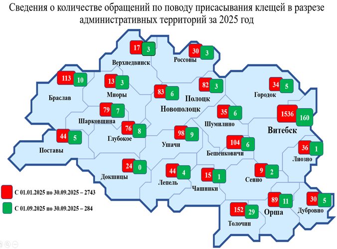 За 9 месяцев 2025 года в организации здравоохранения области по поводу присасывания клеща обратились 2743 человека, из них 986 – дети до 17 лет. За аналогичный период 2024 года за медицинской помощью в организации здравоохранения обратились 2621 человек, из которых 710 – дети.